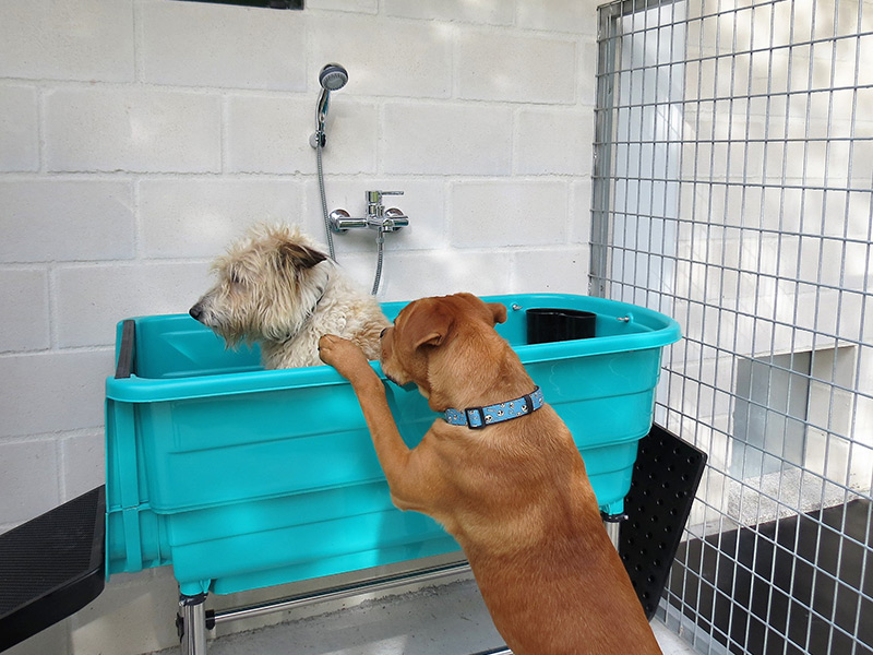 Tenemos un lugar preparado para el aseo del perro en nuestras instalaciones. Si en casa no se dispone de un espacio adecuado, aquí se les puede bañar con comodidad. Se proporcionan champú, toalla y cepillos.